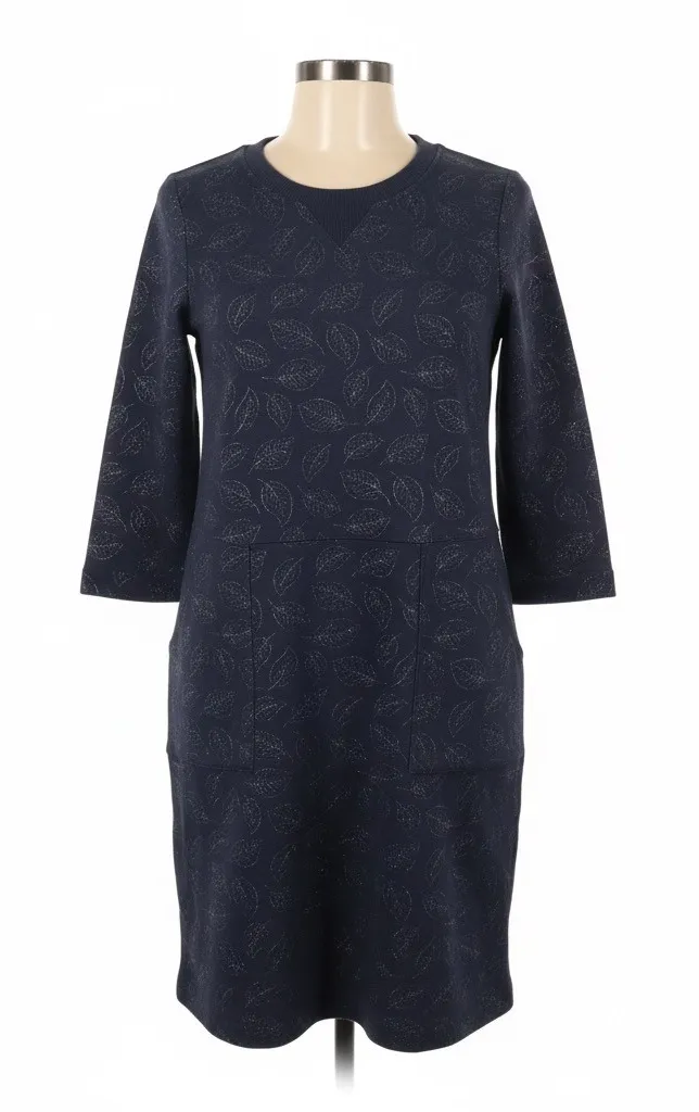 Boden Hannah Sweatshirt Dress 4R Navy Foil Leaf Print Mini Dress Pockets Cozy Style: Sweatshirt Dress Dress Length: Mini Department: Women Sleeve Length: 3/4 Sleeve Pattern: Floral Occasion: Casual Material: Cotton, Polyester Theme: Leaf, Nature, Floral Neckline: Crew Neck Season: Fall, Winter, Spring Closure: Pullover Mini Dress, Sweatshirt Dress, Jumper Dress, Knit Dress, Navy Blue, Metallic Print, Foil Print, Silver, Gold, Leaf Print, Botanical, Cozy, Comfortable, Casual, Cotton Blend, Day Dress, Pockets, Tunic, Mod, Preppy, Loungewear, Winter, Fall Measurements are Approximate: Length 34" Armpit to Armpit 17 1/2" Pre-owned in excellent condition unless otherwise stated. Please see photos for measurements, condition and details. All items are shipped promptly.(7515)
