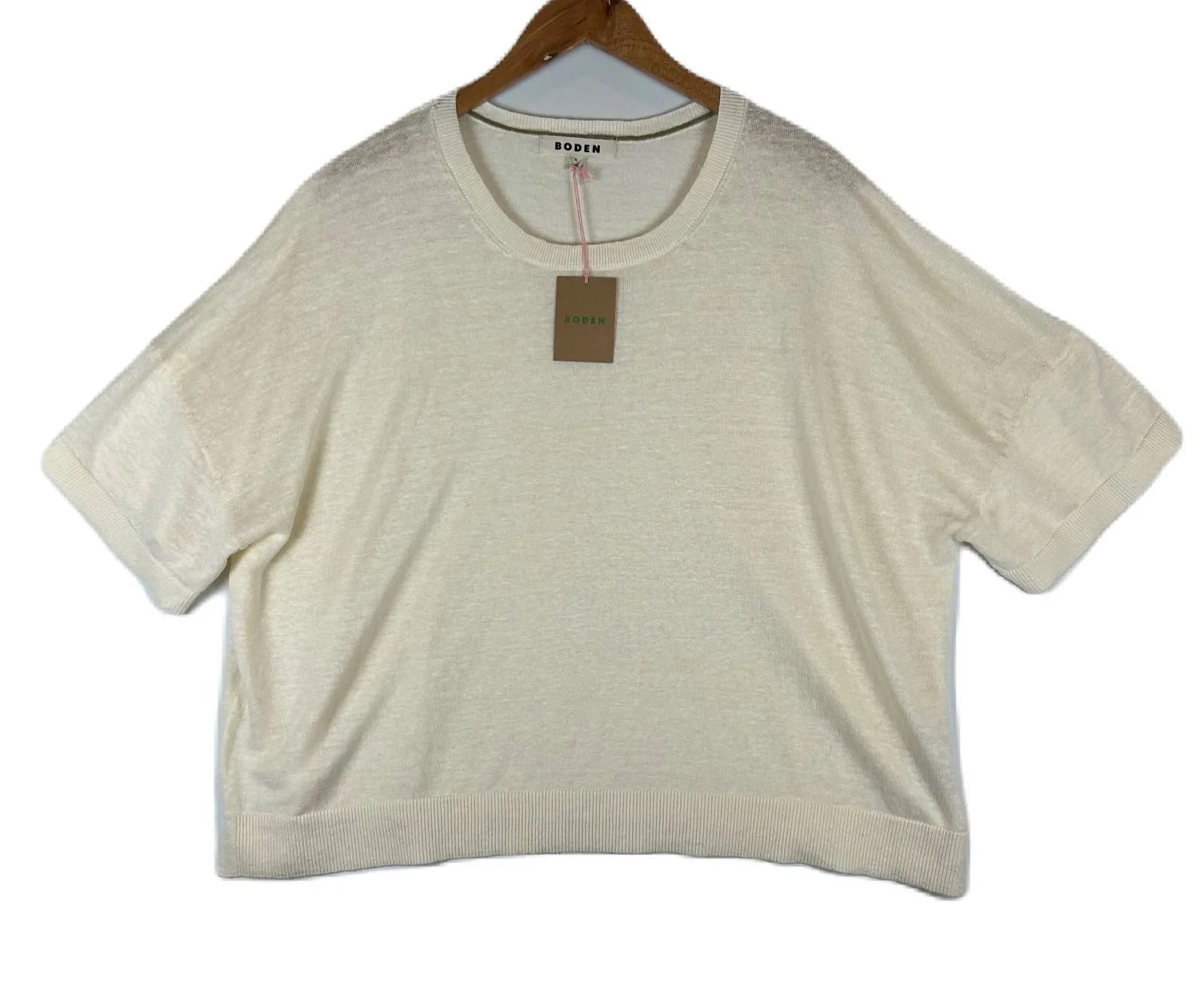 Condition: New with Tag Measurements: Pit to Pit: 27 in Length: 22.5 in Style: Pullover Department: Women Material: 100% Linen, Linen Neckline: Round Neck Sleeve Length: Short Sleeve Type: Sweater Features: Oversized, Lightweight, Breathable Pattern: Solid Sleeve Type: Dolman Sleeve Fabric Type: Knit Season: Spring, Summer, Fall Fit: Relaxed Occasion: Casual 0107 Keywords: Boden sweater, knit top, boxy fit, oversized, short sleeve, crew neck, ribbed hem, ivory knit, linen blend, summer knit, luxe basics, casual chic, loungewear, weekend wear