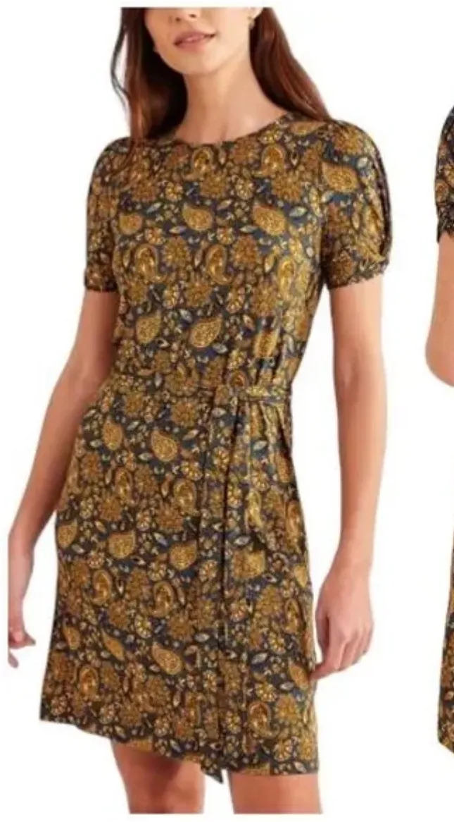 The knotted waist on this stretch jersey midi dress creates a gathered effect that falls effortlessly over the body. Dress it up or down-it's easy like that. 95% LENZING ECOVERO 5% elastane Machine washable Semi-fitted shape Mini length Short sleeves This garment contains LENZING ECOVERO viscose. LENZING and ECOVERO are trademarks of Lenzing AG Detachable self fabric belt Measurements: • Bust: 15 in • Length: 37 in Style: Fit & Flare, Shirt Dress Dress Length: Knee Length Department: Women Sleeve Length: Short Sleeve Pattern: Paisley Occasion: Casual, Party/Cocktail Material: Viscose, Elastane Fabric Type: Rayon Theme: Nature, Art Neckline: Round Neck Season: Spring, Summer, Fall Sleeve Type: Puff Sleeve Closure: Pullover Keywords: Boden dress, paisley dress, puff sleeve dress, belted dress, midi dress, women's fashion, boho dress, vintage inspired, casual dress, day dress, printed dress, flattering fit, feminine style Ships fast from pet & smoke free home. offers welcome! Please review all photos.
