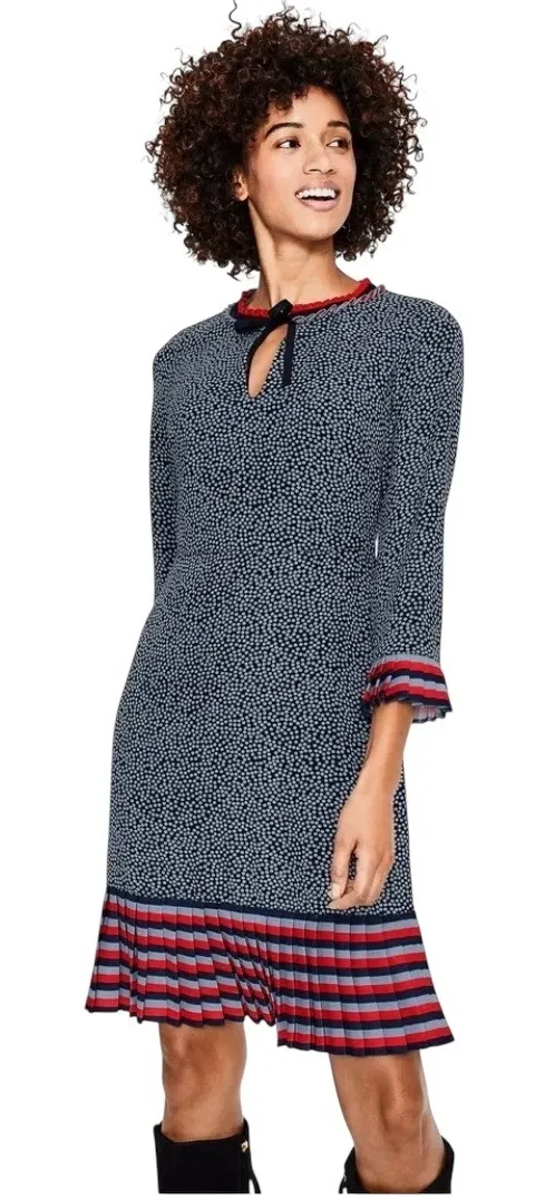 A playful polka dot print meets sophisticated design in this charming dress. The navy backdrop is scattered with delicate white dots, creating a whimsical yet classic look. A keyhole neckline adds a touch of allure, while the pleated hem, adorned with red, gray, and navy stripes, brings a modern, eye-catching detail. Ruffled cuffs on the 3/4 sleeves echo the playful spirit of the dress. This Boden dress has a side zipper and pockets and is made of polyester. It is lined and is in excellent preloved condition. Size 6 US. Keywords: Boden dress, polka dot dress, pleated dress, keyhole dress, navy dress, red and white dress, casual dress, knee length dress, 3/4 sleeve dress, ruffled cuff dress, striped hem dress, size 6 dress, women's dress, party dress, day dress, patriotic dress, July 4th dress