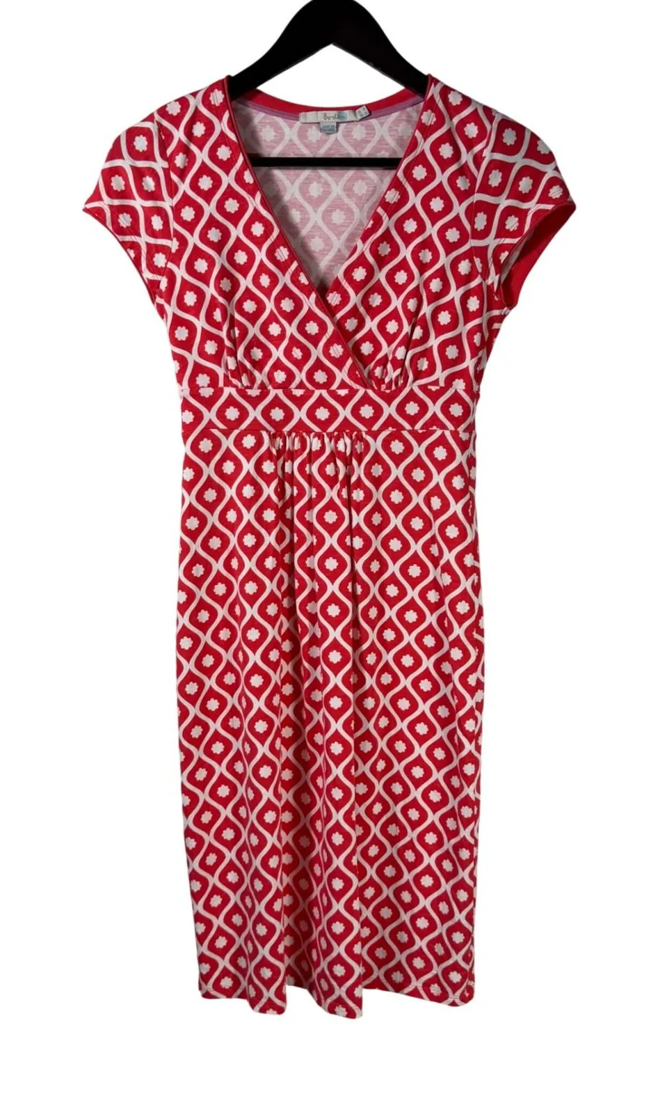 Adorable Boden dress in a bright red and white geometric/floral print. This flattering style features a V-neck faux wrap bodice, cap sleeves, and a comfortable stretchy fabric that makes it perfect for everyday wear, travel, brunch, or summer events. Easy to dress up with wedges or keep casual with sandals or sneakers. • Material: 96% Cotton, 4% Elastane • Made in: Portugal • Style: Faux wrap / fit & flare / V-neck / cap sleeve • Closure: Pull on • Machine washable Measurements: Pit to pit: 14.5" Length: 38" Fabric / Feel: Soft, breathable cotton blend with stretch — comfy, flattering, and easy to wear. wrap, red white, geometric print, picnic, summer, spring, retro print, fit and flare, cap sleeve, V neck, stretch cotton dress, casual midi, travel