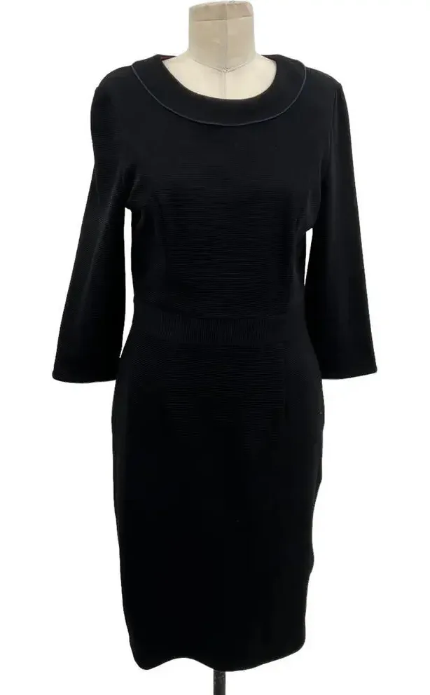 Boden Mia Ottoman Dress in Black. Style J0231 Tailored and textured, this body-con beauty accentuates your waist and fits to flatter. Navy blue detail at collar. Exposed back-zip closure with zip pull Scooped neck Three-quarter sleeves Lined 57% cotton, 42% polyester, 1% elastane Size US 8R Armpit to armpit is approx 18" Waist is approx 14" Hip is approx 19" Length is approx 42"