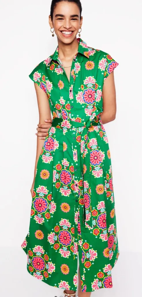 Charming green midi dress with vibrant floral design. Features a flattering tie waist. Ideal for casual outings. Brand New with tag 100% cotton - Machine washable - Fit and flare – For a flattering shape - Designed to fall at mid-calf - Side seam pockets D1169-GRN
