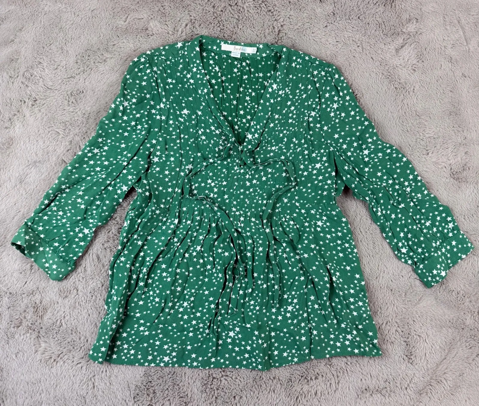 Whimsical charm abounds in this Boden tunic top, a delightful addition to any wardrobe. The vibrant green backdrop is playfully adorned with a constellation of white stars, creating a look that's both eye-catching and effortlessly chic. A flattering V-neckline leads to a tie-front detail, cinching the waist for a customized fit and adding a touch of bohemian flair. The three-quarter sleeves offer versatile styling options, perfect for transitioning between seasons. This top is ideal for a casual brunch with friends, a day of exploring a new city, or adding a pop of personality to your office attire. Color: Green Type: Blouse Department: Women Style: Tunic Material: Viscose, 100% Viscose Neckline: V-Neck Sleeve Length: 3/4 Sleeve Sleeve Type: Classic/Fitted Sleeve Accents: Bow, Button, Pleated Pattern: Polka Dot Features: Tie Front, 3/4 Sleeves, V-Neck, Lightweight Character: Bohemian Fit: Regular Keywords: Boden, Tunic Top, Star Print, Green Top, Tie Front, 3/4 Sleeve, Boho, Bohemian, Casual Top, Womens Top, Size 8, UK 12, Viscose Top