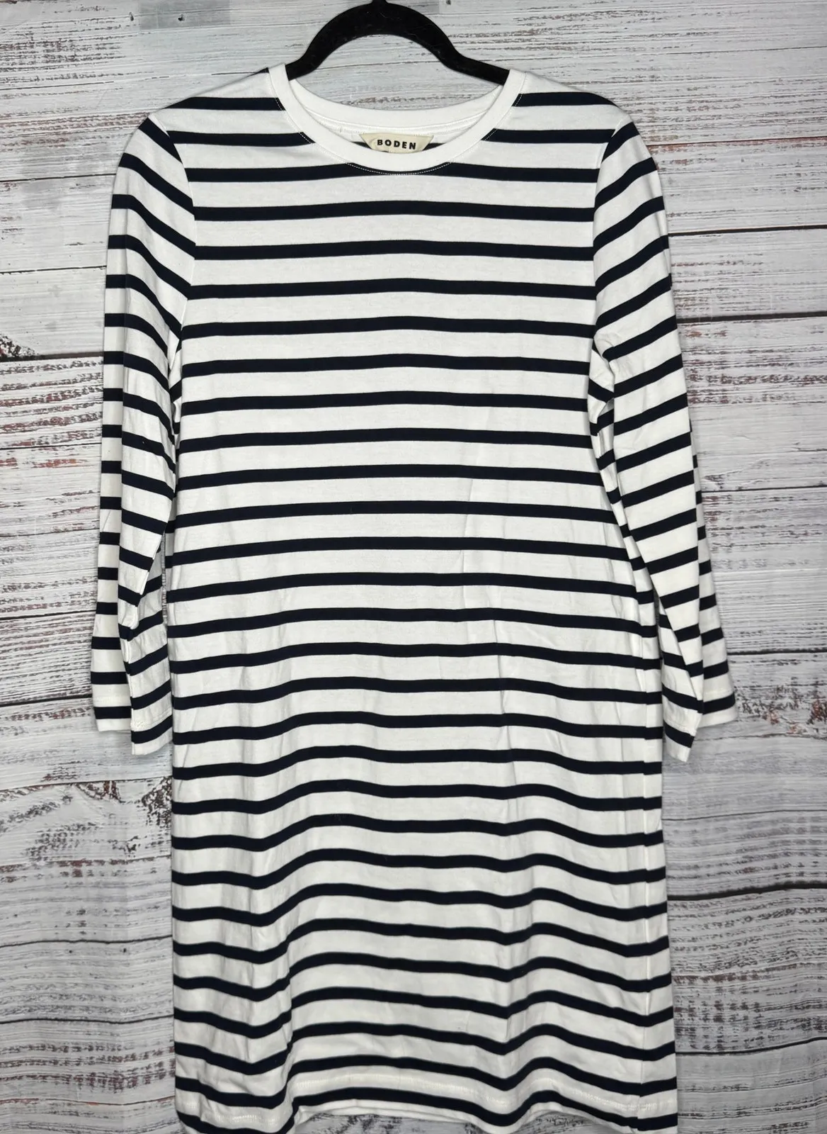 Classic Boden striped dress in navy and white with a timeless boatneck silhouette and three-quarter sleeves. Made from soft jersey knit with a slight stretch for comfortable everyday wear. Perfect for casual outings, travel, work, or layered with a jacket. Measurements (approx., flat) Bust (pit to pit): ~19.5" (39" actual) Length (shoulder to hem): ~36–37" Sleeve length: ~17" (3/4 length) Brand: Boden Size: US 6R / UK 10R Color: Navy & White Style: Striped knit dress Neckline: Classic boatneck Sleeves: Three-quarter Material: Stretch cotton/jersey blend Made in: China Condition: Pre-owned, very good — no visible stains or holes Features Timeless Breton stripe pattern Soft, breathable stretch knit Versatile and easy to wear Wardrobe staple for every season Keywords Boden dress, striped dress, navy white dress, Breton dress, casual knit, boatneck dress, women’s size 6, cotton blend dress, travel dress