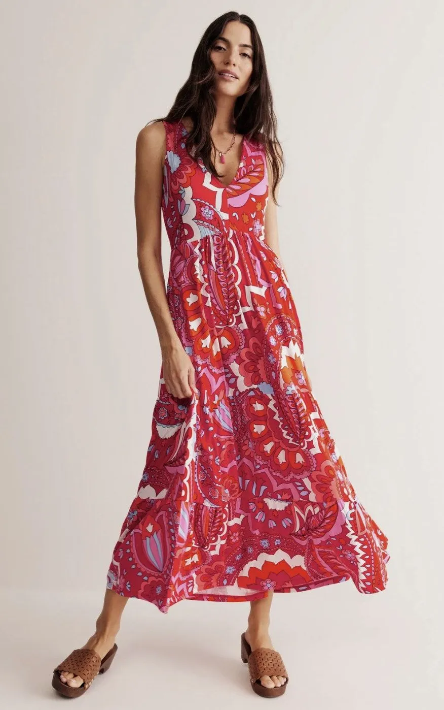 Even if the weather isn't doing its bit, you can inject a bit of sunshine into your day in the form of the Sylvia dress. Made from jersey, it's shaped with a tiered skirt and sleeveless V-neck bodice. Oh, and how could we forget about our signature patterns ? Side seam pockets Flattering fit and flare shape Maxi length Soft drapey jersey with stretch Lined bodice 95% Viscose (LENZING™ECOVERO™) / 5% Elastane
