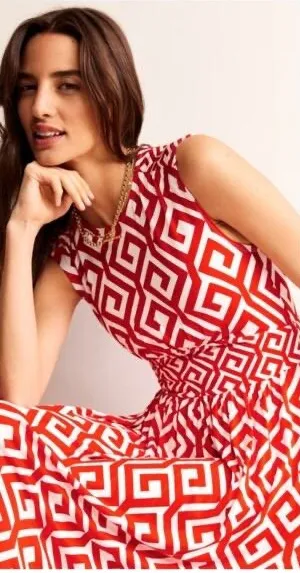 The Thea midi dress is fitted through the top with a contrasting waist panel and falls into a gently gathered skirt that swishes as you move, whether you're strolling in the park or power walking on the commute. - 95% LENZING M ECOVERO T™ 5% elastane - Machine washable - Semi-fitted shape - Midi length Measurements: • Bust: 14 in • Length: 44 in Style: Sundress, A-Line, Fit & Flare Dress Length: Midi Department: Women Sleeve Length: Sleeveless Pattern: Geometric Occasion: Casual, Party/Cocktail Material: Viscose, Elastane Fabric Type: Rayon Theme: Aztec Neckline: Round Neck Season: Spring, Summer Sleeve Type: Cap Sleeve Closure: Pullover Accents: Smocked Keywords: Boden, maxi dress, geometric print, smocked waist, sleeveless, summer dress, resort wear, vacation dress, statement dress, flowy, elegant, bold print, womens fashion Ships fast from pet & smoke free home. offers welcome! Please review all photos.