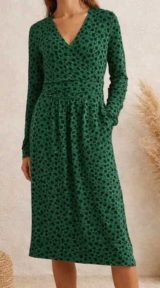 size 4R. Effortlessly chic and endlessly wearable, this Boden Layla V-Neck Jersey Dress is the perfect everyday-to-work staple. Crafted in a soft, stretchy jersey knit, this green and black printed dress features a flattering faux wrap V-neck, long sleeves, and functional pockets for comfort and ease. The pull-on silhouette drapes beautifully while offering stretch where you want it—ideal for casual days, travel, or polished office looks. Details you’ll love: • Size 4R • Soft stretch jersey knit • Flattering V-neck faux wrap style • Long sleeves • Side pockets • Knee-length silhouette • Green with black print • Excellent pre-owned condition, no flaws noted • Smoke-free home Measurements Length (shoulder to hem) - 42” Width (armpit to armpit) - 18” Sleeves (shoulder to cuff) - 28” A timeless casual-to-work dress that pairs effortlessly with boots, flats, or heels year-round. ✨ Perfect for fans of Boden, modern casual dresses, workwear staples, and elevated everyday style.