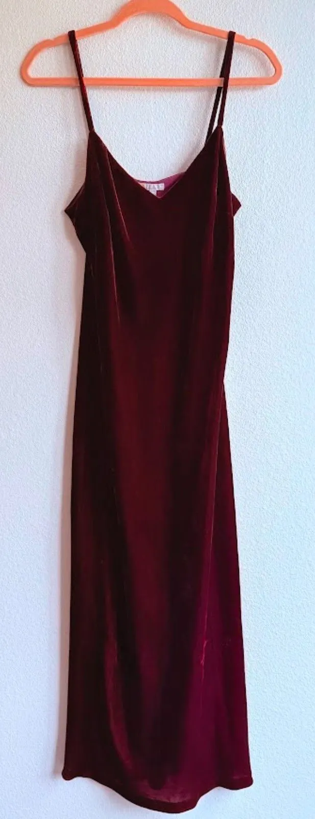 This lightweight velvet slip dress from Boden makes an excellent addition to your transitional closet, especially for Fall and Winter layering, with fun tights! Sweetheart V Neckline with non-adjustable spaghetti straps, lined bust so you can go braless Soft to touch and light weight, perfect for layering over long sleeve tops or under dusters breathable crushed velvet material with romantic sheen, Viscose blend Columnar tall midi length for slip dress, no slits - relaxed fit 90s the craft witchy goth vibes, in bloody wine red tone on tone velvet Excellent gently preloved condition, no signs of wear MSRP $175, sold out flat measurements: 17.5" pit to pit 17" waist 20" hip 51" length, top of bust to hemline (not including straps)
