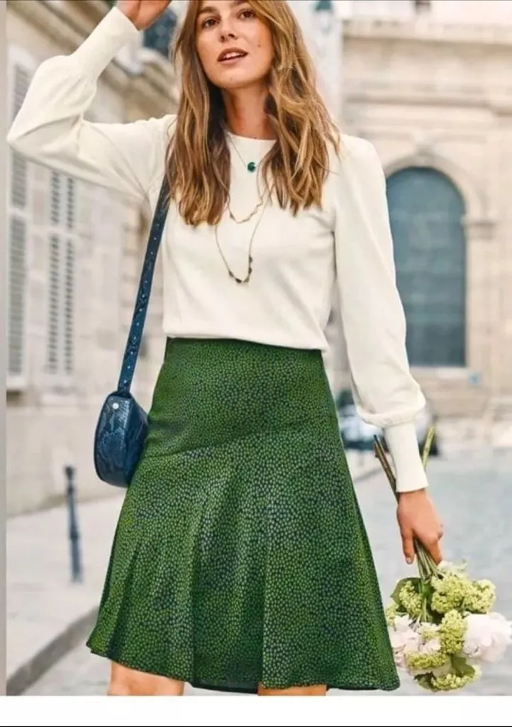 Perfect Fall Skirt! EUC with no flaws. This Virginia skirt from Boden is flattering fitted at the hip and the fabric falls in elegant drapes. Soft and lightweight. For an elegant and classy look, this skirt is right above the knee. A-line style Polka dot print Fully lined Back zipper closure