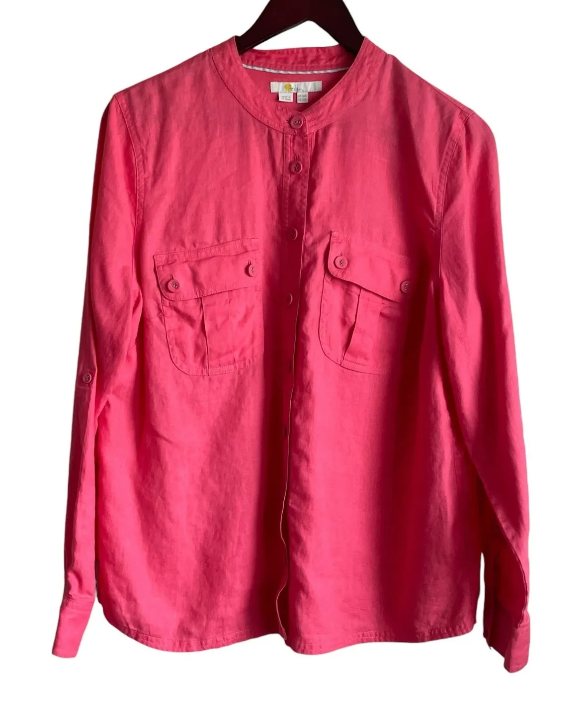 Boden Women Delores Linen Top S Coral Classic Sustainable Career Office Travel Well cared for condition - no flaws noticed Features:: (First picture truest color) -rounded hem -lightweight -round band collar neck -roll tab long sleeve -fabric covered button up -relaxed silhouette -100% linen, machine wash Style Profile: comfortable, easy care, packable, feminine, versatile, work, office, weekend, vacation, breathable, natural fabric Approximate Measurements: flat lay: * SEE MEASUREMENTS IN PHOTOS Pet/smoke free home 1-2 day shipping Bundle Discounts on Multiple Items