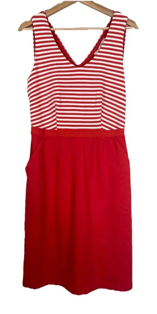 The Boden Women's Dress is a stylish and versatile piece perfect for a business setting. Made from a comfortable cotton blend knit fabric, this sleeveless dress features a flattering v-neckline and classic striped pattern. With a convenient zip closure and knee-length design, this dress is easy to wear and perfect for the summer, fall, and spring seasons. The addition of red and white stripes adds a pop of color, while the convenient pockets add both functionality and style. Ideal for a size 8 woman looking for a classic and sophisticated A-Line dress.