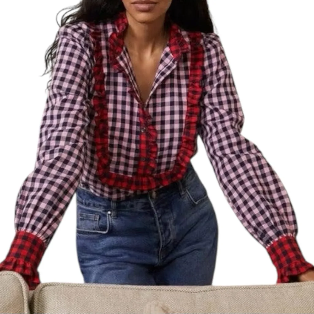 Boden Women’s Size 2 Red Pink Checkered Gingham Cotton Isla Frill Prairie Detail Blouse Shirt ▪️ Exc... Show more