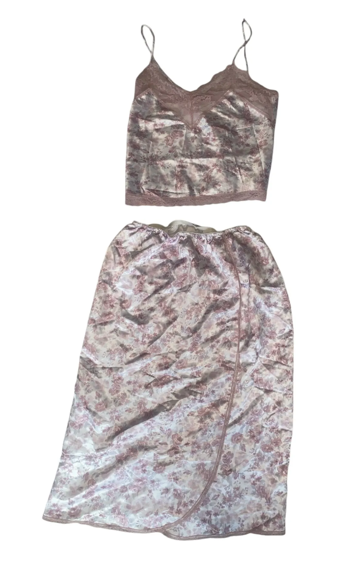 vintage floral pink and white slip top and midi skirt set, a few pulls throughout brand is body chi... Show more