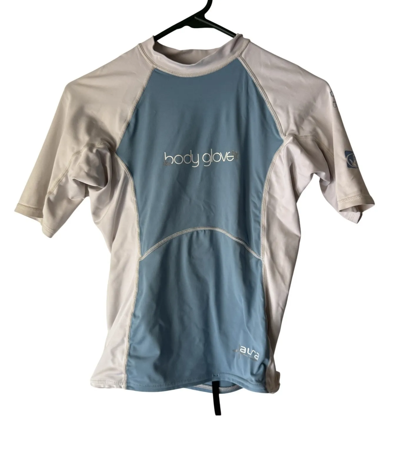 Body Glove Aura UV Shirt Large Blue White UPF 50 Sun Protection Swim Rash Guard Condition: Gently worn, no visible flaws or signs of heavy use Material: 88% nylon, 12% spandex Tag size: Large Main color: Blue with white side panels and sleeves Front and back feature Body Glove Aura logos Left sleeve features Body Glove hand logo and '50+ UV Protection' text Short sleeve, crew neck, stretchy quick-dry fabrication Style number: 5184W Pullover design with flatlock seams for comfort Approximate measurements: 21" length (shoulder to hem), 17" chest (pit to pit, laid flat) Ideal for swimming, surfing, or outdoor activities Made for reliable sun protection and performance in water environments