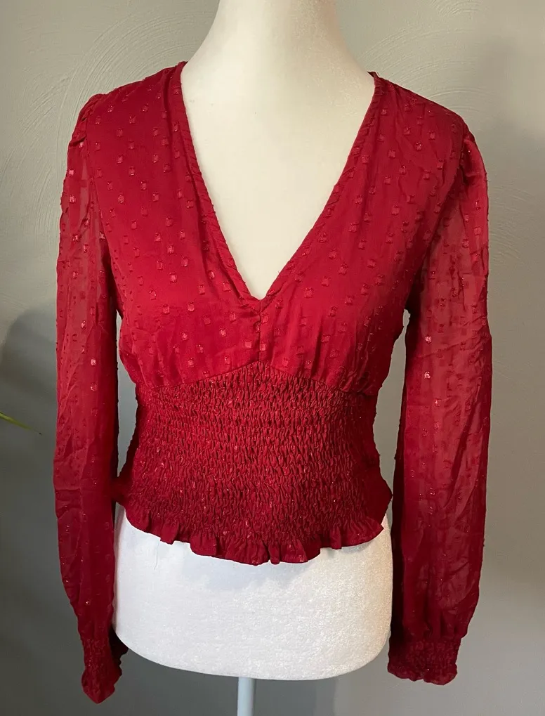 This beautiful blouse from B.O.G. Collective features a rich, dark red color with a subtle dotted texture. It has a flattering V-neckline and long, sheer sleeves with a delicate swiss dot pattern. The smocked, elastic waist creates a comfortable and defined silhouette. The top is perfect for a variety of occasions, from a casual day out to a night on the town Holidays Boho Cropped Lantern sleeve