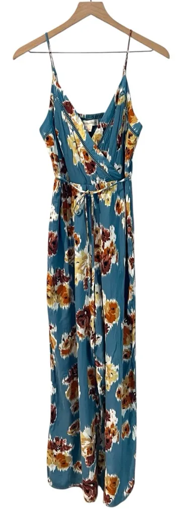 BOG Collective Floral Spaghetti Strap V-Neck Tie Waist Wide Leg Jumpsuit Size S Embrace elegance with this stunning floral jumpsuit. Featuring a beautiful blue base with brown and orange floral patterns, this jumpsuit is perfect for any occasion. The spaghetti straps add a touch of sophistication. Crossover v-neck with lattice trim Adjustable straps Wide leg Smocked back bodice Tie Waist Flowy fit 1928