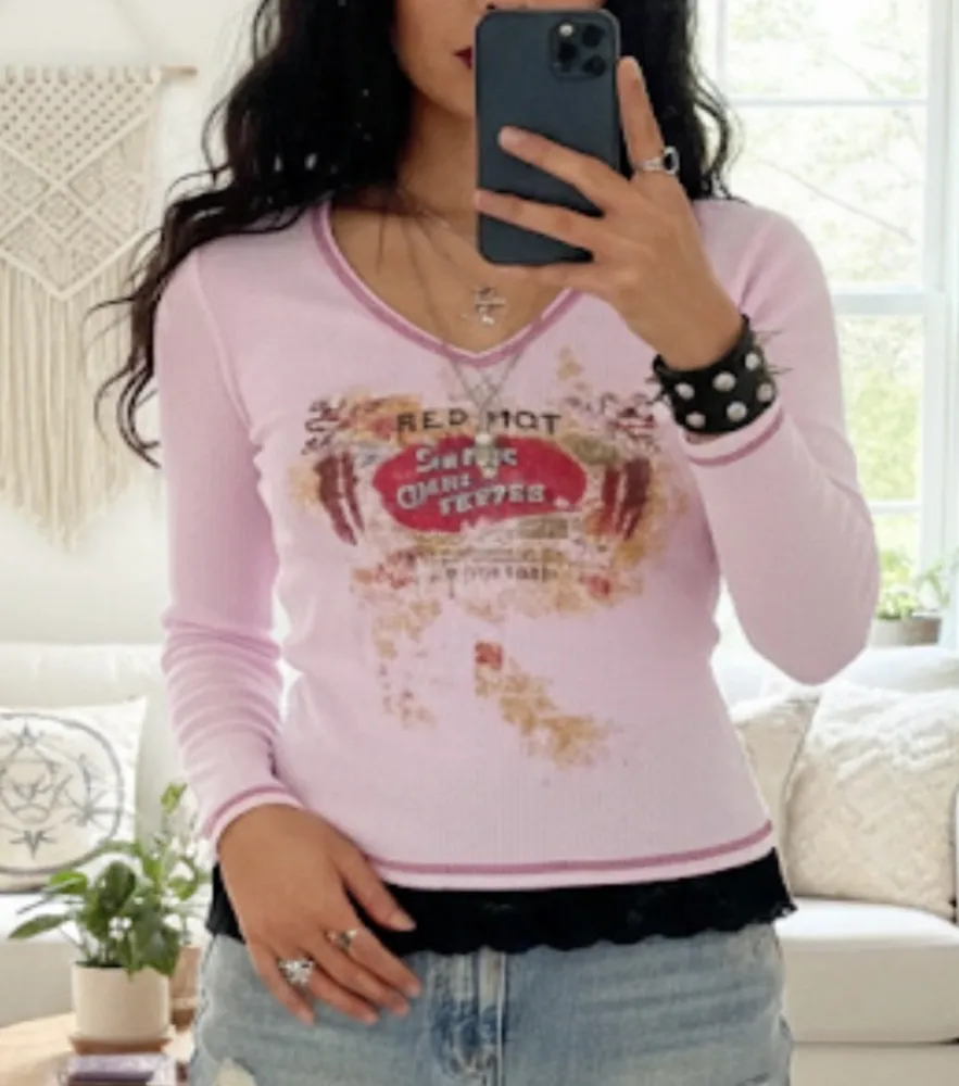 Vintage Y2K Lapis Red Hot Super Chili Pepper Graphic V-Neck Top Size Petite Small Gently used - minor wash wear. Intentionally distressed graphic. Petite fit Approx. 14.5” pit to pit & 20” length Baby pink with red contrast stitching Ribbed cotton Long sleeves Cropped Distressed peppers graphic print on front & upper back Baby tee vtg 90s early 2000s