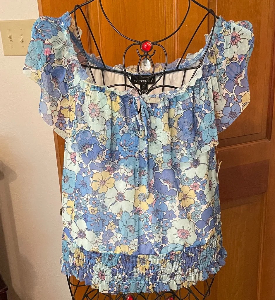 Embrace a fresh look with this floral off-shoulder top. Featuring a blend of blue, yellow, and white hues, it's perfect for any casual outing. Sheer fabric. Body of too is lined. Ruffled neckline. Elastic neckline and waist. Tie front. New, with tags. Bundle to save!! 18x20