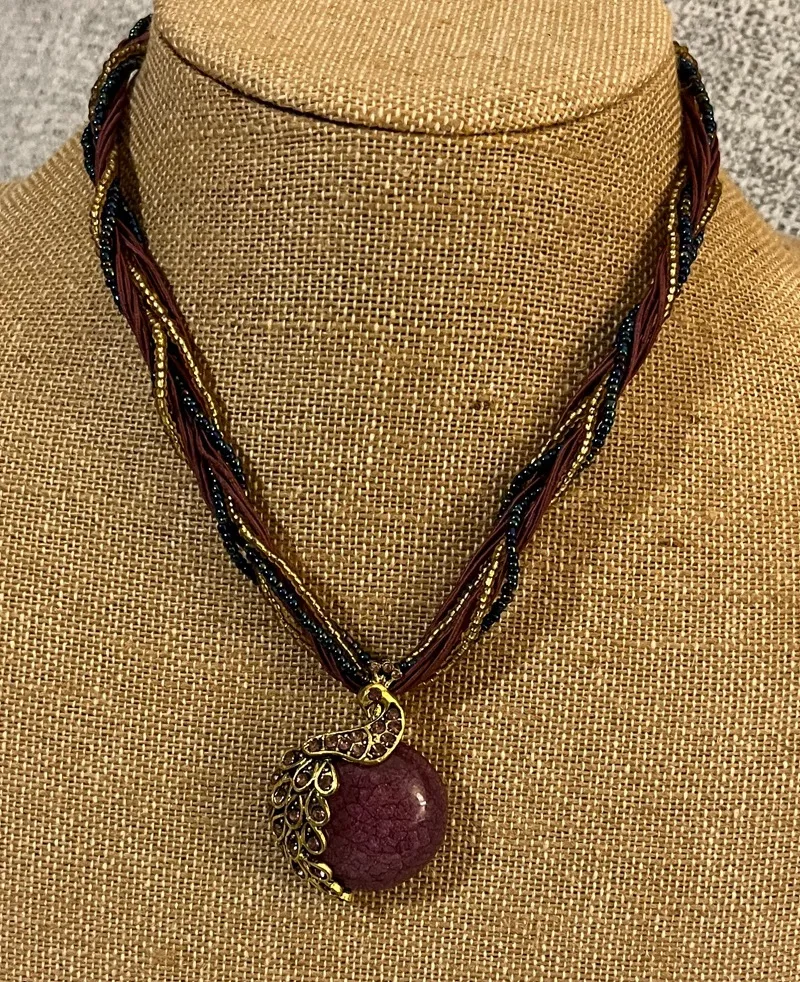 This item is a bohemian-style braided necklace with a large, purple stone pendant enveloped by a gold tone peacock with purple rhinestones. The multi-strand braided cord features gold, dark red, and dark blue threads or cords, and the pendant is set in an ornate, antique-style gold-tone filigree metalwork. This elegant necklace features a stunning multicolor design with a unique pendant. Perfect for adding a touch of sophistication to any outfit.