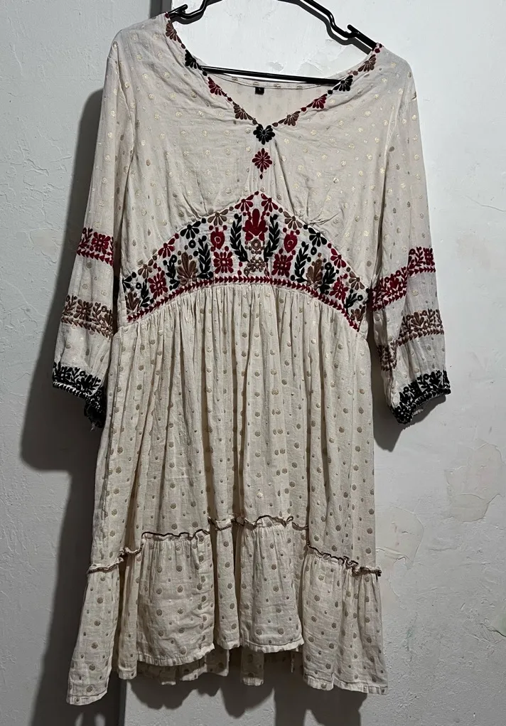 Chic bohemian dress featuring intricate red and black embroidery on a cream background. Perfect for casual outings. Embroidered Dress Size L Tunic Beige Boho Ethnic Style Pre loved in Great condition Size L please see measurements Embrace elegance with this pure cotton dress, featuring a charming floral pattern and delicate lace details. Its light, breathable fabric ensures comfort, while the long sleeves and short silhouette offer a stylish, flattering fit. Perfect for spring and summer outings, this dress combines effortless beauty with everyday comfort