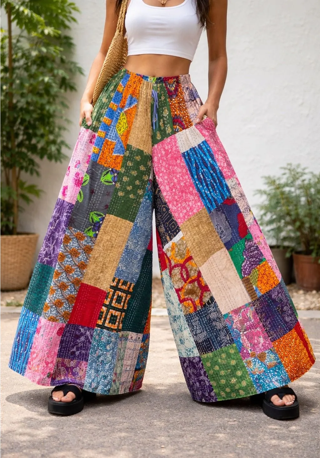 Vibrant patchwork artistry defines these bohemian palazzo pants. Each section bursts with unique patterns and colors, creating a captivating kaleidoscope of style that moves beautifully with you. The wide leg silhouette offers ultimate comfort and freedom, while the drawstring waist ensures a perfect fit. Imagine yourself twirling at a music festival, strolling along a sun-drenched beach, or enjoying a relaxed brunch with friends in these eye-catching trousers. B1 Style: Harem Department: Women Material: Cotton Leg Style: Wide-Leg Type: Pants Fabric Type: Knit Features: Pockets, Elastic Waist, Comfort, Lightweight Closure: Drawstring, Pull On Pattern: Geometric Accents: Quilted, Embroidered Theme: Bohemian, Hippie Occasion: Casual Fit: Relaxed Rise: Mid (8.5-10.5 in) Keywords: patchwork pants, palazzo pants, boho chic, festival wear, hippie style, wide leg, flowy pants, ethnic print, summer pants, vacation attire, casual, unique design, artisanal