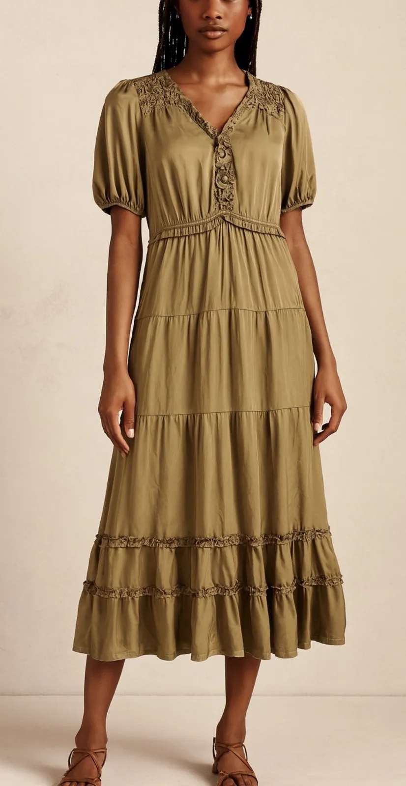 BOHME green satiny tiered long ruffled midi dress sz S Great condition other than one tiny spot on... Show more