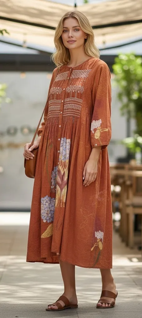 Brand: Cord Studio Frida Dress MSRP: $237 PTP: 26" Length: 51" This dress is made from cotton fabric in a relaxed silhouette. It features smocking on the yolk, gathers on the side and buttons along the front. Pattern: Foliage Floral Tropical Sleeve Length: Full Sleeves Details: Smocking details on the yoke, Front button fastening Fit: Relaxed Fit Material: Cotton Rust Orange Brown Flare Care: Dry clean only gentle hand wash SKU: 00116