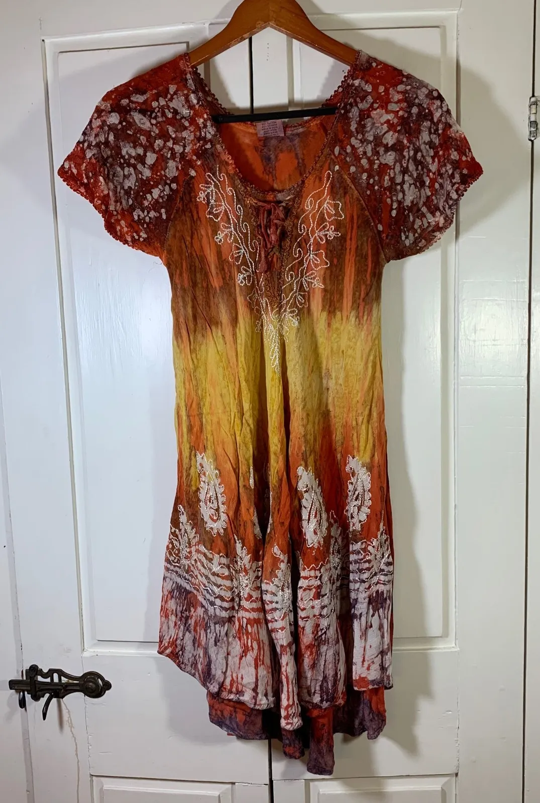 boho, festival, hippie, indie, y2k, 2000s, earthy, rainbowcore, gypsy, hand dyed, grunge fairy, witchy, handmade, Burning Man, Coachella vibes boho, hippie, festivalwear, India cotton, tie-dye, embroidered, indie, y2k, peasant dress, lagenlook, cottagecore Boho tie dye tunic dress in vibrant orange and yellow hues. Features delicate white embroidery on the bodice and hem, with a lace-up neckline and crochet trim. This versatile piece is perfect for casual wear, beach days, or music festivals. Type: Tunic Department: Women Style: Tunic Material: Cotton, Viscose Neckline: V-Neck Sleeve Length: Short Sleeve Sleeve Type: Flutter Sleeve Pattern: Paisley Accents: Crochet, Embroidered Theme: Bohemian, Fairy Features: Lightweight, Sheer Fabric Type: Crochet Occasion: Casual Closure: Tie Season: Summer, Spring Keywords: bohemian, tie dye, embroidered, tunic, crochet trim, lace up, free size, short sleeve, summer, beachwear, festival wear, casual, hippie