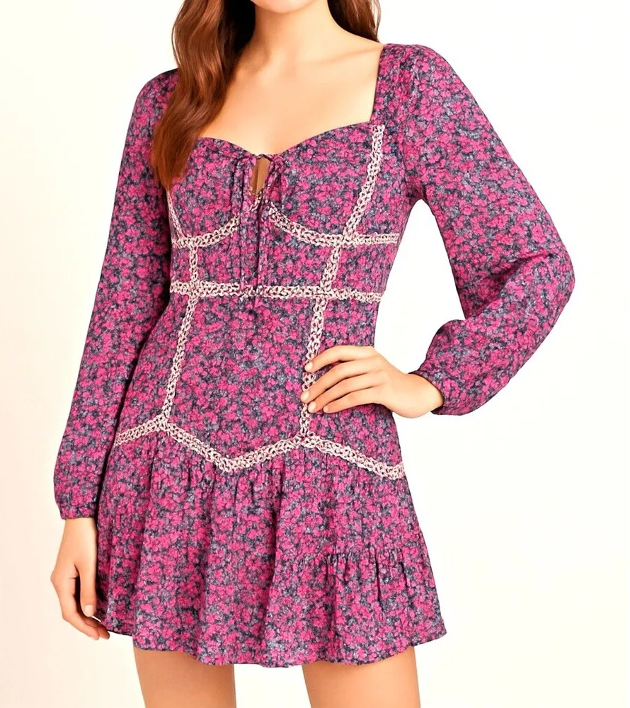 Boho Floral Mini Dress L Womens Long Sleeve Ruffle Hem Cottagecore Lace Trim Pre0wned really good c... Show more