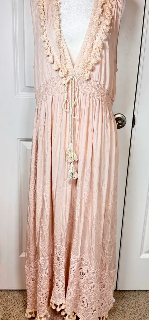 Soft, romantic boho maxi dress with a smocked waist and dreamy, flowy silhouette — perfect for festival, vacation, cottagecore, or beach weekend looks. This blush pink maxi features a deep V neckline trimmed with crochet pom-pom details, an adjustable tassel tie front, and a delicate lace hem with fringe for movement and texture. Details • Size: XXL • Color: Blush / soft pink • Length: Maxi / floor length • Style: Boho, romantic, festivalcore, cottagecore • Features: Smocked waist, tassel tie, lace hem, crochet trim • Condition: Excellent pre-owned; no visible flaws Lightweight and breathable with an ethereal, feminine drape — easy to dress up or wear casually. (Inventory 0603)