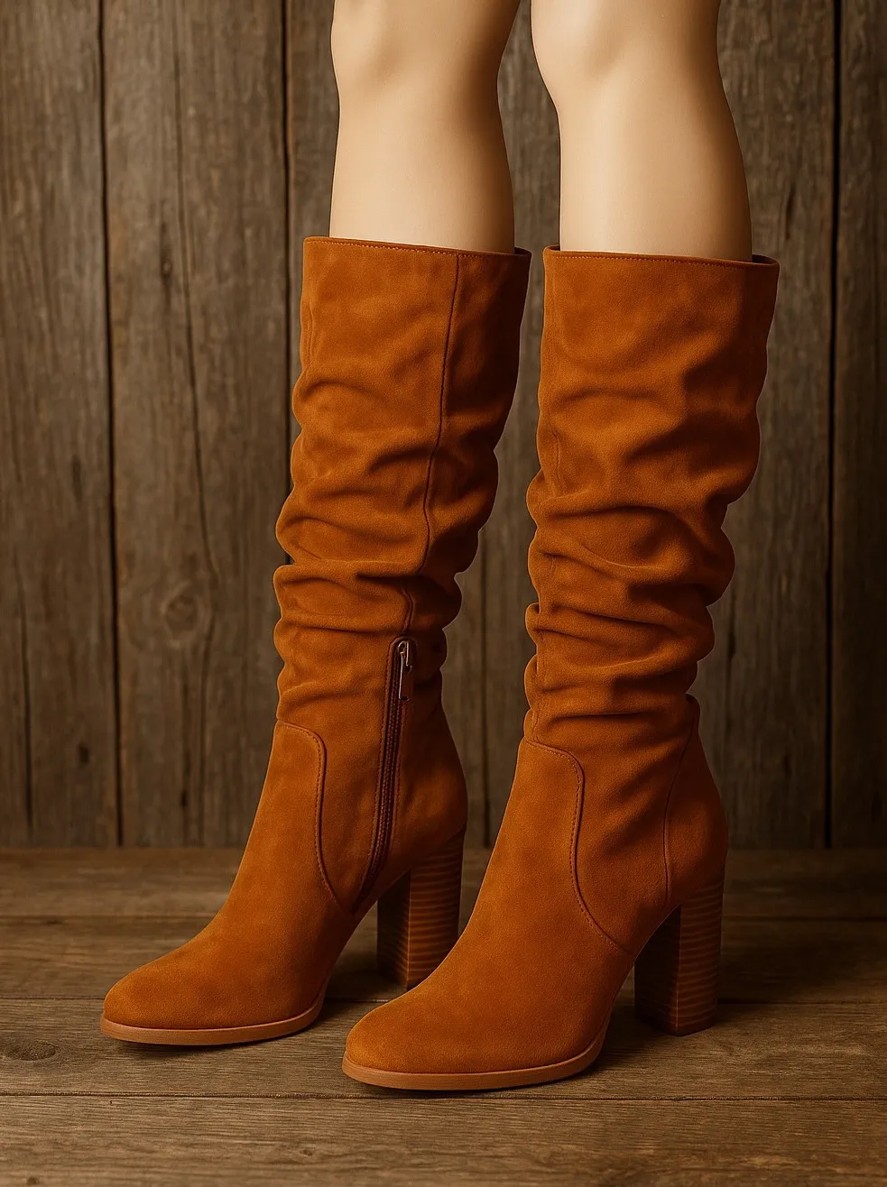 Soft slouchy knee-high boots in a warm camel/cognac brown faux suede. Classic silhouette with a stacked block heel that's comfortable and easy to style for fall and winter. Gently worn. Light wear on soles only. Uppers are clean with no rips, stains, or major flaws. Details: • Size: Women's 5 • Color: Camel / cognac brown • Material: Faux suede • Style: Slouchy knee-high • Closure: Side zipper • Heel: Stacked block heel • Toe: Almond Approximate Measurements: • Heel height: ~3.5" • Shaft height (from heel): ~15–16" • Calf opening: ~12–13" (measured flat) Smoke-free home. Please review photos for condition and measurements. #fallboots #neutralstyle #classicchic