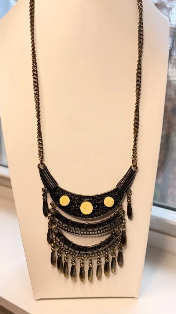 This necklace offers a bold design with intricate bronze detailing and yellow accent stones. Its layered design pairs well with casual or formal attire. • Bronze chain and pendant • Intricate detailing with layered elements • Yellow accent stones for a pop of color • Lobster clasp closure for secure wear • Necklace length approx. 12 inches Top to bottom = 12 inches