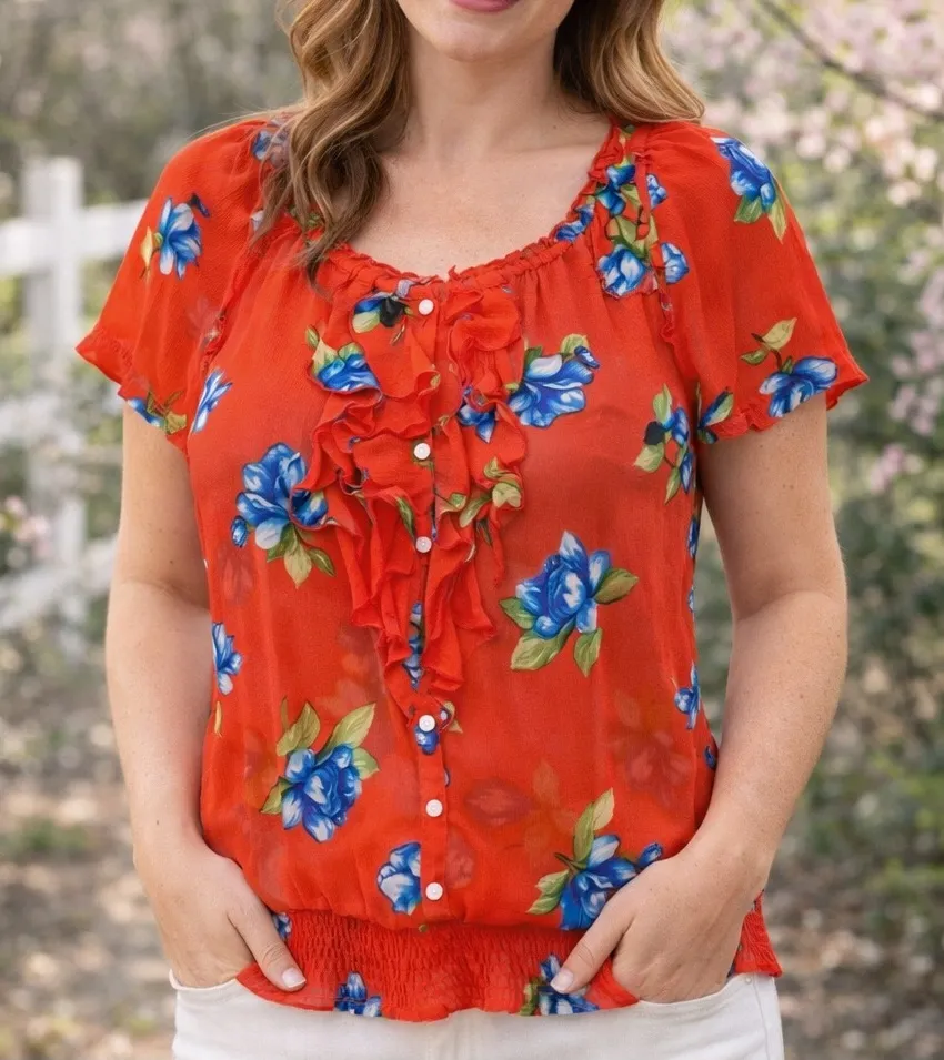 Make a statement with this bold, romantic floral blouse by Gilly Hicks Sydney. Designed in a vibrant... Show more