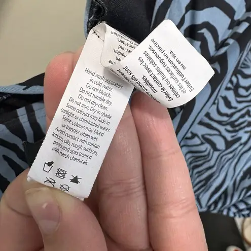 This is a one-piece swimwear from Bond-eye Australia, designed for women with a size 10 and D/DD cup. The swimwear features a blue and black zebra print, with wide straps and a pleated design. It is made of nylon and spandex, and includes a built-in bra, tummy control, and adjustable straps for a custom fit. The swimwear is lined, padded, and has a boost/push-up effect for a flattering look. It is suitable for beach and poolside wear, and showcases the brand's commitment to quality and style with its made-in-Australia construction.
