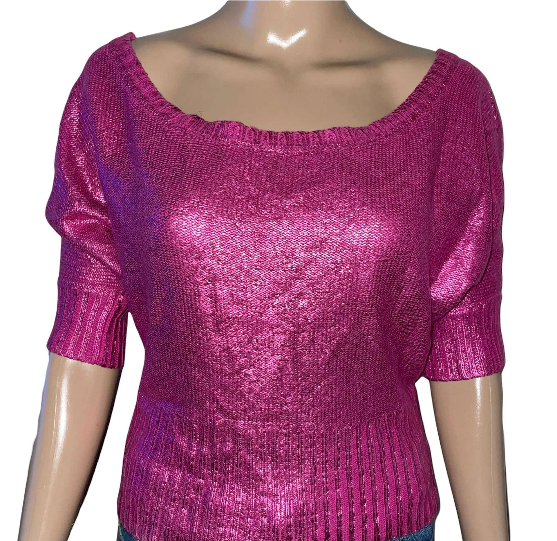 In excellent condition. Hot metallic pink. Short dolman sleeves. Scoop neck. Ribbed hem and sleeve c... Show more
