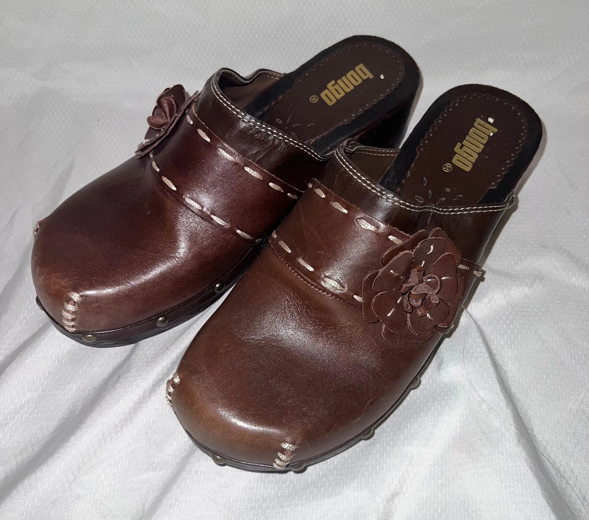 Y2K leather baby brown open Bongo clogs in good condition and has stitching and these small flowers... Show more