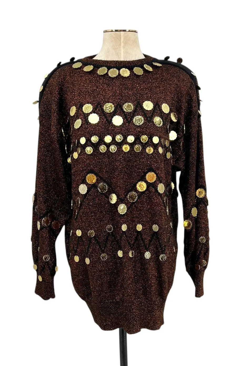 Bonnie Boerer Coin Trim Vintage Metallic Gold Sweater Dolman sleeve sweater with shoulder pads in coppery gold on black knit material. This awesome sweater is covered in Queen Elizabeth "coins" in different sizes. 55% ramie 17% cotton 18% rayon 10% polyester Size Large