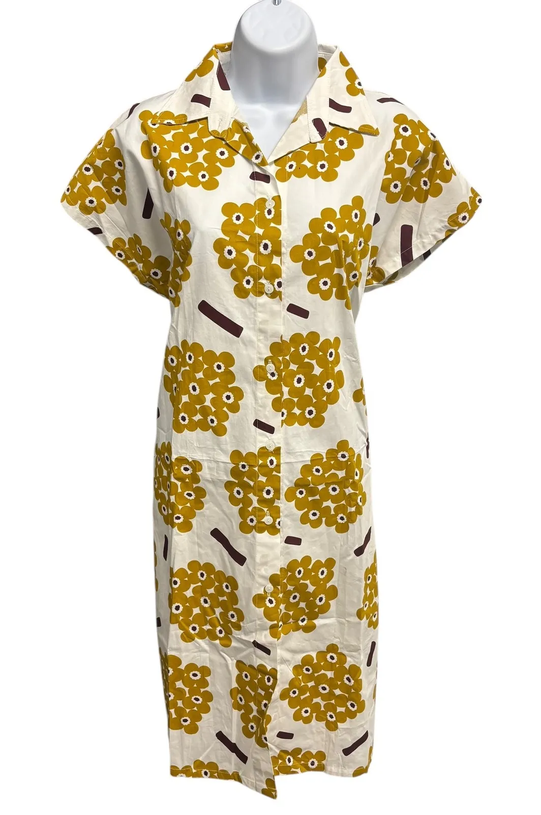 Bonus by Ananya women's dress in a size medium featuring a vibrant yellow floral print on a white background. This shirt dress design includes a classic collar, short sleeves, and a button-down front. The hemline falls to knee length, offering a comfortable and versatile silhouette. Subtle dark red rectangular accents are interspersed throughout the floral pattern. Style: Shirt Dress Dress Length: Midi Department: Women Sleeve Length: Short Sleeve Pattern: Floral Occasion: Casual Fabric Type: Woven Neckline: Collared Season: Summer, Spring Sleeve Type: Kimono Sleeve Closure: Button Accents: Button Features: Collared, Pockets Country of Origin: Thailand Keywords: floral dress, yellow dress, shirt dress, midi dress, button front, short sleeve dress, casual dress, summer dress, day dress, patterned dress, Ananya