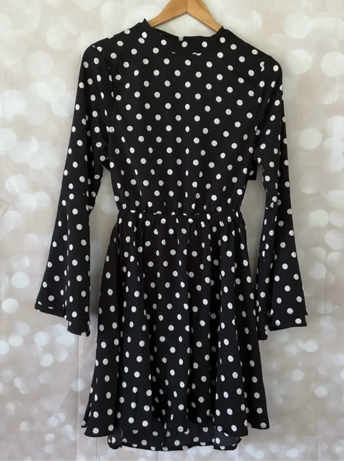 Boohoo Black Dress with White Polka Dots New with tags Size 6 Open back Machine washable Stretch... Show more