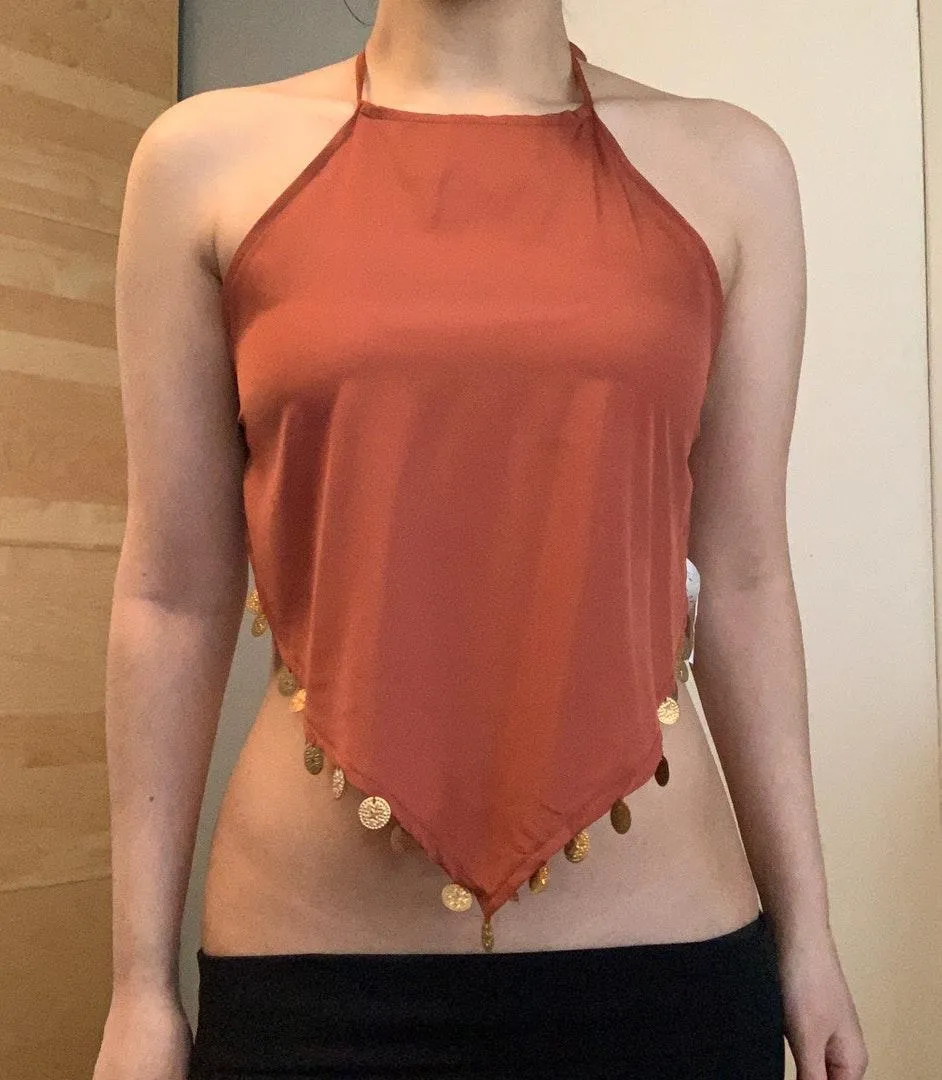 Coin trim triangle handkerchief scarf top in rust. Worn once to Coachella and lost two of the coins... Show more