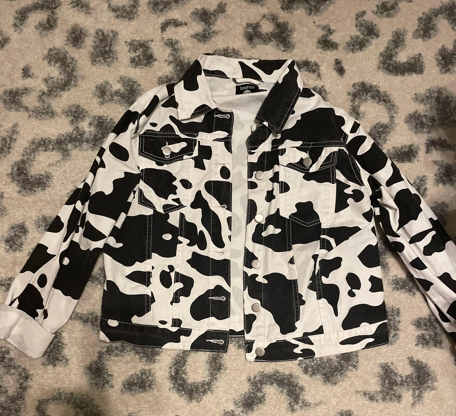 Boohoo Cow Print Cropped Denim Jacket Multiple Size 6 - $22 (56% Off Retail) - From Hannah