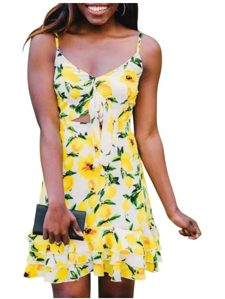Boohoo Lemon Print Mini Dress Cutout Tie Front Ruffle Hem Summer Women Size 6 This Boohoo mini dre... Show more