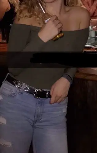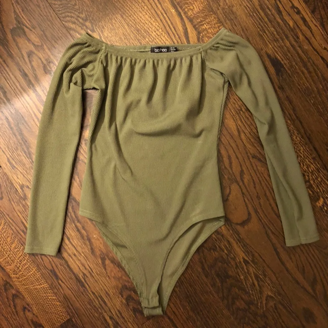 A tight, olive green, off-the-shoulder bodysuit. In perfect condition Fits true to size.