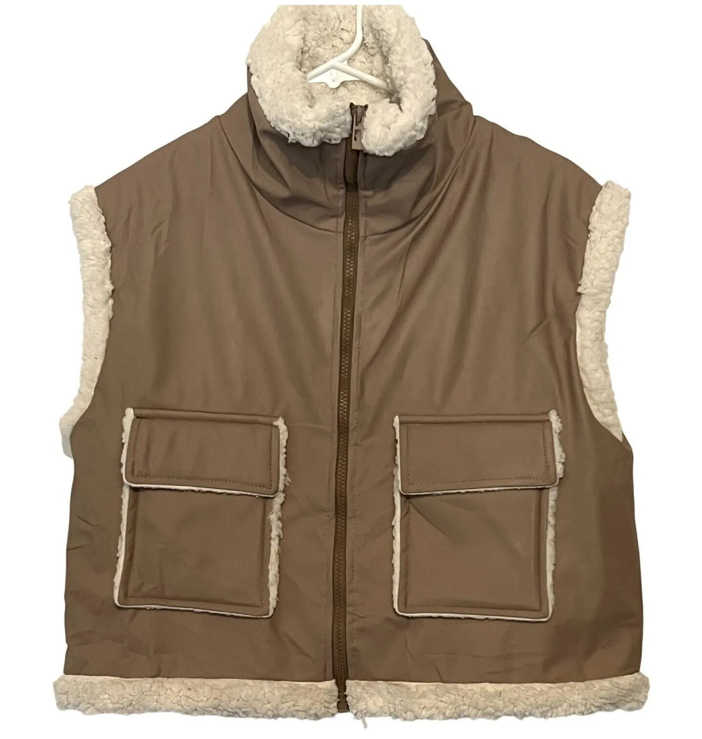 Boohoo Womens Sherpa Vest Size 10 Tan Faux Leather Lined Pockets Full Zip NEW WITH TAGS 20" armpit... Show more