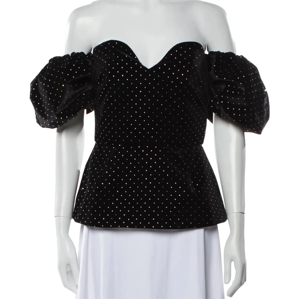 Excellent condition Crafted from a sumptuous velvet and adorned with tiny crystals, the Alma Top guarantees glamour. The beautiful figure-flattering cut features a sweetheart bodice, fitted waist and puff sleeves. Dress down with jeans, or pair with the matching Henley trousers for maximum drama. Off-the-shoulder full sleeve top CB zip fastening 95% POLYESTER 5% SPANDEX / LINING: 100% RECYCLED POLYESTER