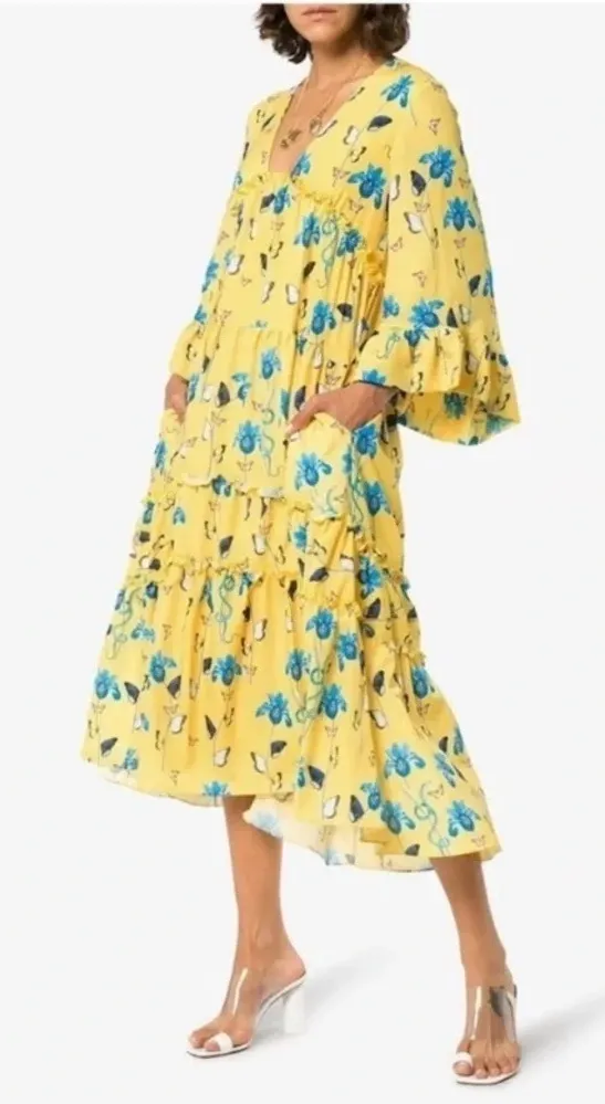 Borgo De Nor Iris Yellow Floral Print High Low Dress Butterfly Print Size 6 IRIS PRINTED HIGH-LOW DRESS IN IRIS YELLOW Fabric: Crepe Floral print Midi length V neck Long sleeves Hook-and-eye at back High-low hem. Maxi length. UK 6 - US 2 Preowned no flaws! Flatlay Measurements (approximate) Length front 47 inches Length Back 52.5 inches Chest 17 inches Sleeve from pit 15 inches Waist 16 inches