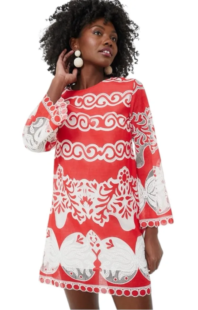 Make a statement in this stunning Borgo de Nor Stevie Lace Mini Dress, a bold, artistic silhouette crafted in vibrant red and crisp white lace embroidery. Known for its luxurious fabrics and modern femininity, this style blends effortless elegance with standout detailing. Perfect for resort wear, vacation, brunch, parties, or any event where you want to turn heads. Details • Brand: Borgo de Nor • Style: Stevie Lace Mini Dress • Color: Red, white embroidered lace • Silhouette: Shift/mini dress • Neckline: Round neck • Sleeves: Three-quarter sleeves • Closure: Back zip • Luxury embroidered lace pattern • High-end statement piece • MSRP: $1,534 • Ideal for vacations, holidays, events, and resort evenings Size & Fit • Size: 14 (UK 14, fits approximately US 10–12, see measurements) • Fit: Intended to be a relaxed, slightly A-line mini dress • Approximate Measurements: -P2P: 20” Flat -Waist: 18.5” Flat - Length: 33.25” Condition • NWOT (never worn, no tag) • Pristine condition, no flaws to actual dress noted, but the material/care tag fell off. Borgo de Nor, Stevie Dress, Lace Mini Dress, Embroidered Dress, Red White Dress, Resort Wear, Vacation Dress, Luxury Designer Dress, Event Dress, Summer Mini Dress, Statement Dress, Shift Dress, Holiday Dress