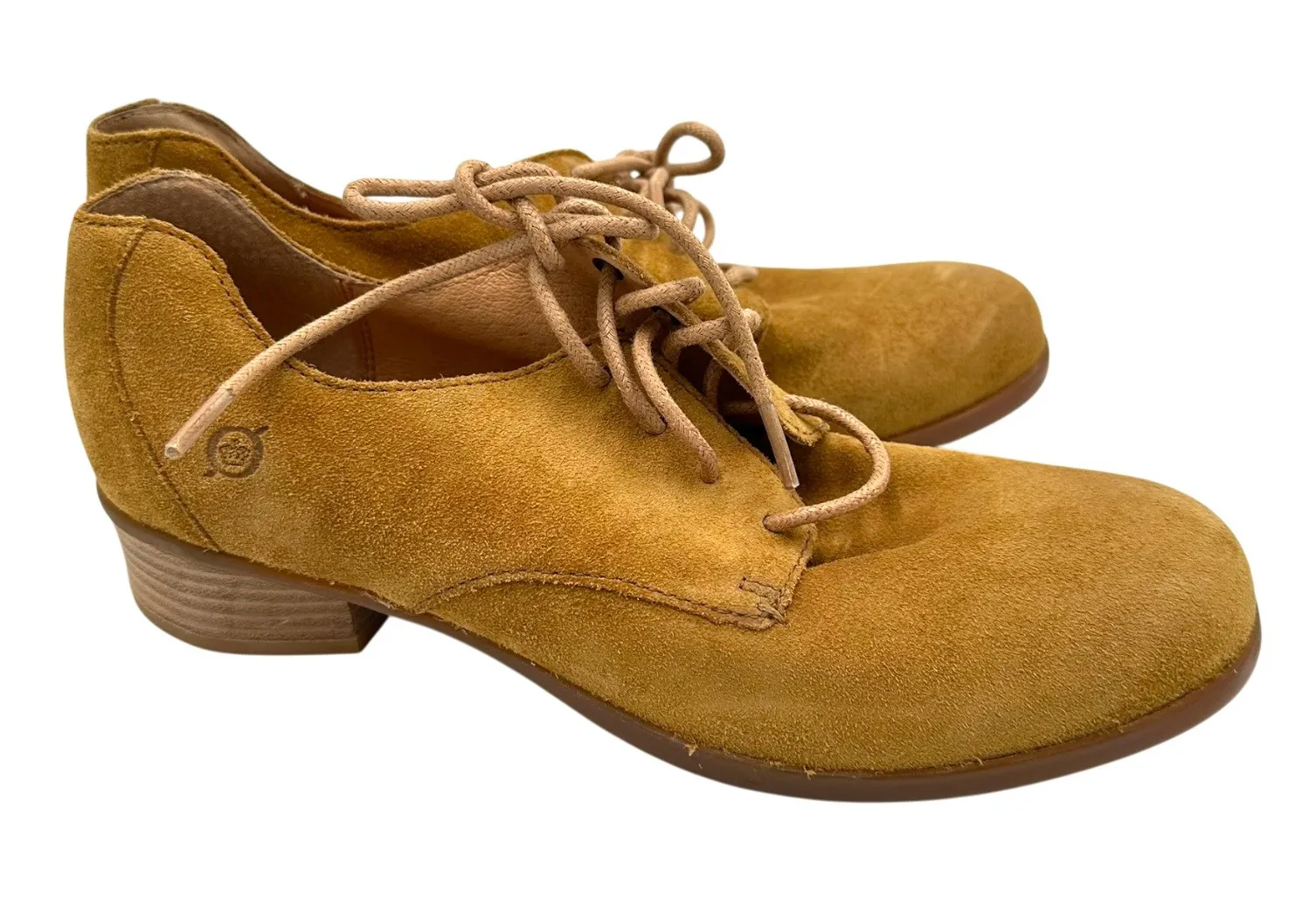 Women's Size 9.5 Brown Tan Golden Suede Block Heel - Lace Up Pre-Owned in Great Condition Heel Height: 1.5" Step into timeless charm with these Born Hand Crafted Footwear Oxford shoes. The rich tan suede offers a touch of natural elegance, perfect for complementing any ensemble. Designed for comfort and style, these lace-up shoes feature a subtle block heel that adds a touch of sophistication without sacrificing wearability. The intricate detailing and the signature Born craftsmanship promise enduring quality and a look that transitions effortlessly from day to night. Imagine these gracing your feet during a leisurely weekend brunch or adding a polished finish to your work-from-home attire.