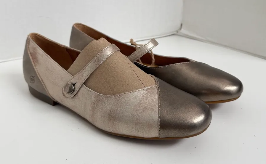 The Born Pandora Hand-finished leathers and a petite button give our Pandora Mary-Jane a unique, vintage allure and one-of-a-kind look. Gorgeous color-blocked flats are rich with retro charm. They are made of a breathable soft fabric lining and a soft fabric-covered footbed with extra foam for added comfort. The Opanka handcrafted construction makes them a durable choice. Feminine yet understated, these ballet flats are sure to become an all-season favorite. High traction flexible lightweight rubber outsole. New with tags. One small imperfection on the inner left shoe. Hard to see in most lighting. See last picture. Color: Pewter / Gold (Metallic) Size: 11 Heel Height: 1/3 Inch
